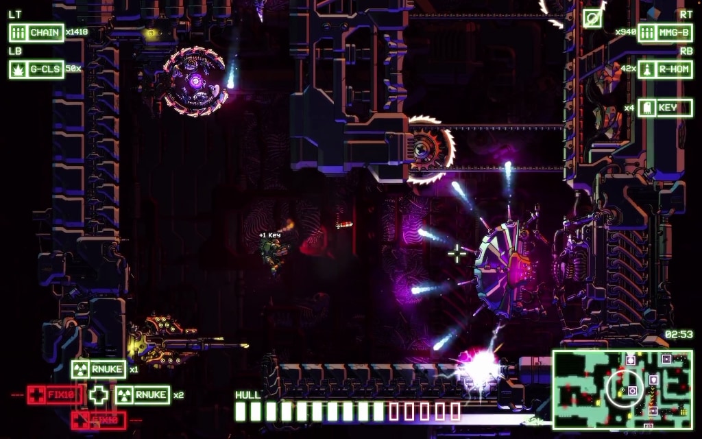 Target ships are procedurally generated; check the map to plan your attack route through the interconnected computer systems. Buy weapons, ammo and equipment from your funds. Then smash your cybernetic opponents and make bank. Hunt for tech upgrades and fulfil secondary objectives for additional rewards including the retrieval of alien artifacts which unlock new mech suits. Rinse, repeat.