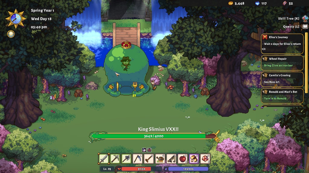 Of course this is ignoring one of Sun Haven’s biggest selling points. It has an RPG style plot and bosses to fight. Some bosses are easy, some will go away after a few days, others are harder. It’s still a more casual type of game where everything is optional. You can challenge yourself with a speedrun or take it easy, level up, gear up, and take stacks of potions with you. Or ignore the bits not for you. I’m mostly taking my time with the main story. Which is about a looming darkness and evil. You are chosen by the dragon guardian to sort it out, so far mostly involving exploration, combat, and fetch quests. Including travelling to other towns where you can run more farms. Up to three total.
