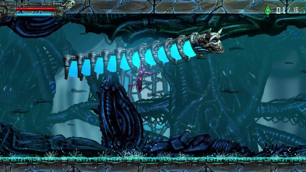 The whole aesthetic, music and art, plays right into my tastes. Heavy metal sci-fi bio horror. Love it. One of my favourite bosses was plant based. Spewing out flying jelly fish, of course. It gave me a tonne of trouble because colliding with a spawning ghost like creature drugged me and caused the screen effects to go super wobbly. Three hits like that and I’m dead, but luckily that count and the woozy effects reset after a short time.