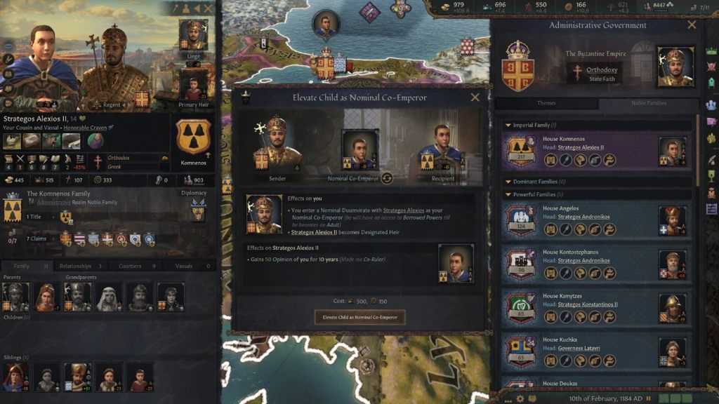 “The glory and might of the Byzantine Empire are yours to command in this Major Expansion to Crusader Kings III. The unique politics and cultures of the heir to the Roman Empire are on display through a new governing system, new ways for characters to progress up the societal ladder, and new activities for them to engage in. You can also explore a new exciting lifestyle as a landless Adventurer, seeking fame and glory across a living map of the medieval world.”