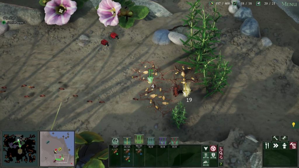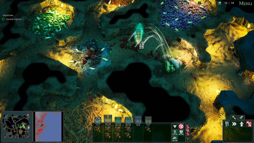 The central tactics revolve around resource management. Particularly food and unit numbers. To collect food you need ants that can travel long distances and fight off enemies. Setting up a brood of eggs costs food. Broods for each type of unit are essentially spawn points with each tile equalling a single unit. When the unit dies it respawns at the cost of some food. Connected broods form armies that can be sent to rally points using pheromones. This is what creates the streams of ants that will undertake tasks. There’s a bit more to it but this is the core stuff.
