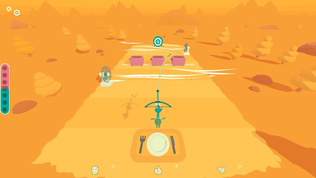 “Fling to the Finish is a cooperative racing game where teammates are tethered together by a stretchy elastic rope. Get up close and personal with your partner to maneuver two characters bouncing, rolling, and flinging their way to the finish line!”